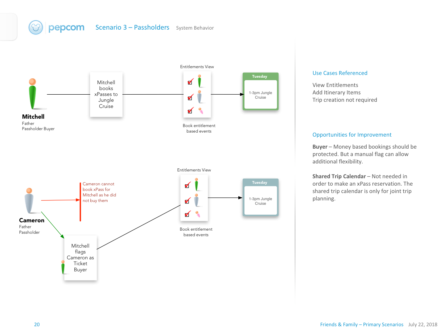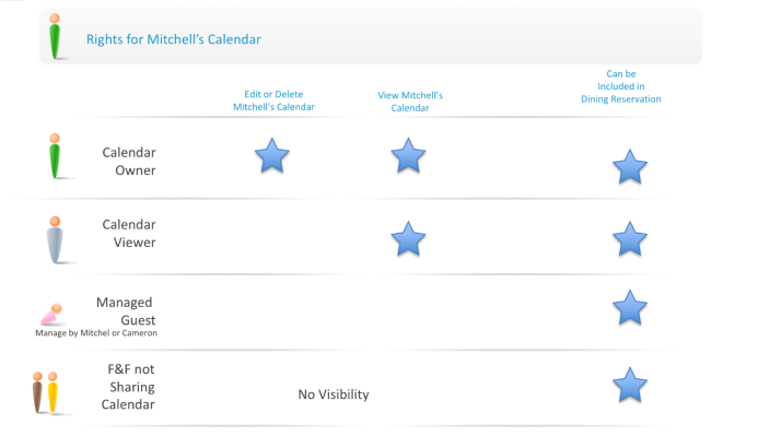 Many permissions matrices were needed to clarify functionality. Again characters were used to clarify which type of guest we were referring to.